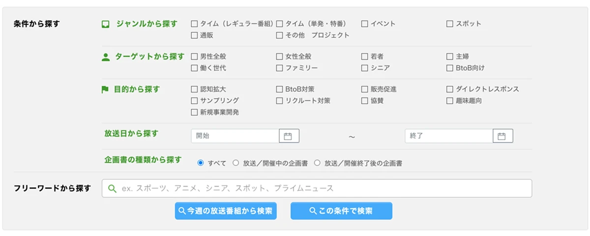 ジャンルやターゲット、目的、放送期間など、掲載された営業資料を絞り込むことができます。