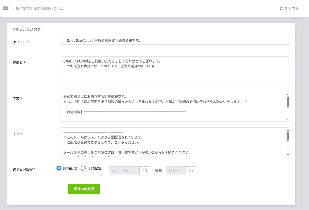 配信日時を指定しての予約配信、すぐに送信できる即時配信の両方に対応しています。